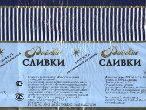 Фантик от конфеты "Райские сливки" со сливочной начинкой